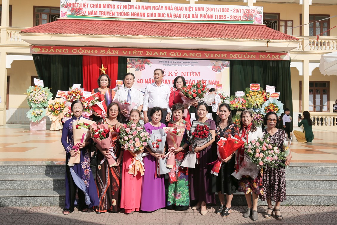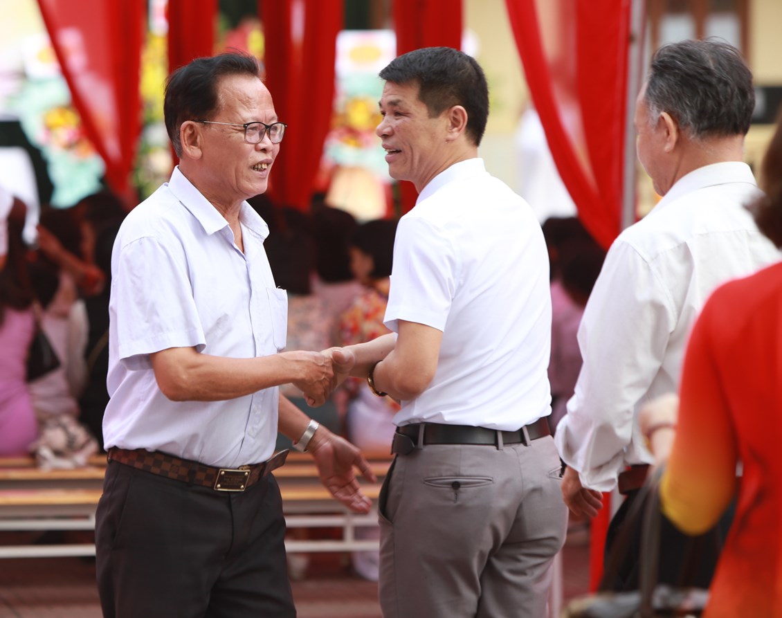Đại diện BGH nhà trường: Thầy Vũ Tiến Thắng Bí thư Đảng bộ - Hiệu trưởng tặng hoa chúc mừng thầy Đàm Thế Đức nguyên Hiệu trưởng nhà trường (1999 - 2006)